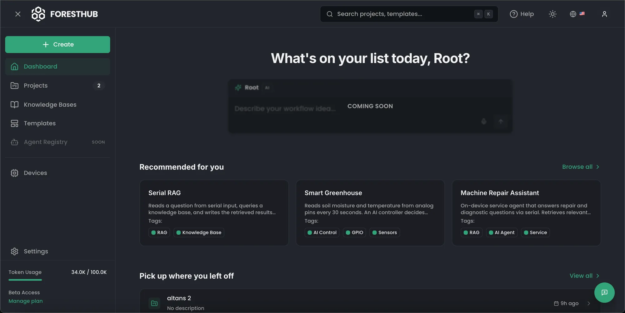 Starting today, developers and Edge AI teams can register for free at app.foresthub.ai. Visual no-code builder, portable C code, hardware agnostic, privacy by design.